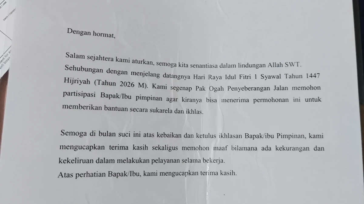 Dalam surat yang beredar, tertulis judul “Jumpa Tahunan Penyeberang Jalan (Pak Ogah)” dengan perihal Permohonan Tali Asih Lebaran. Surat itu ditujukan kepada pimpinan perusahaan dan tertanggal Semarang, 9 Maret 2026.
